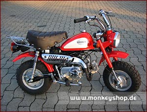 Honda Monkey Basis, Made in Japan, Motorradzulassung mit110er Motor, 4-Ganggetriebe, Handkupplung, verstärkte Stoßdämpfer, Tacho 120 Km/h, CDI-Zündung, 12 Volt, 8“ Räder, Metallschutzbleche, Gepäckträger, rot, das Original… 3699 €
