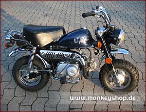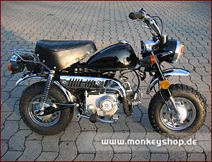 Jincheng Monkey Replica, Mokickzulassung,, CDI-Zündung, 12 Volt, 8“ Räder, verchromte Felgen und Schutzbleche, rot, schwarz, dunkelblau, gelb, Gepäckträger